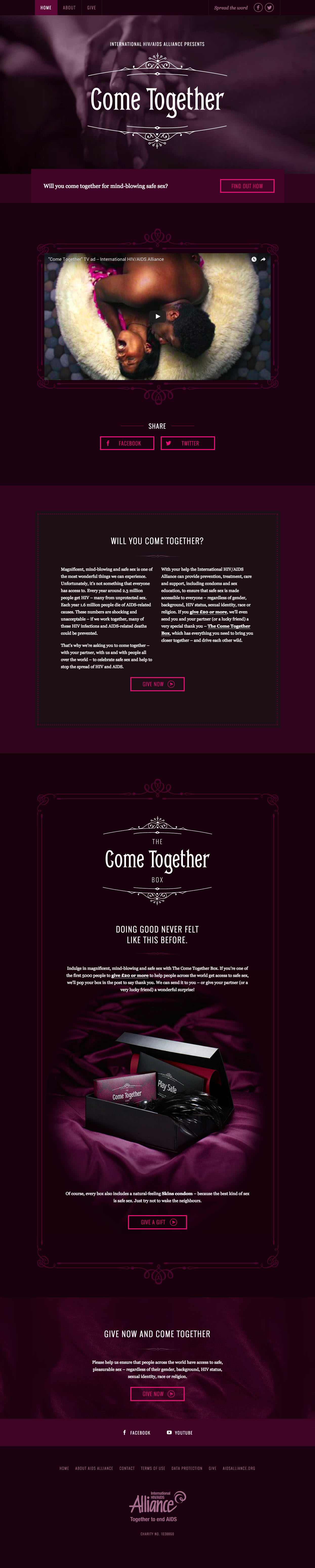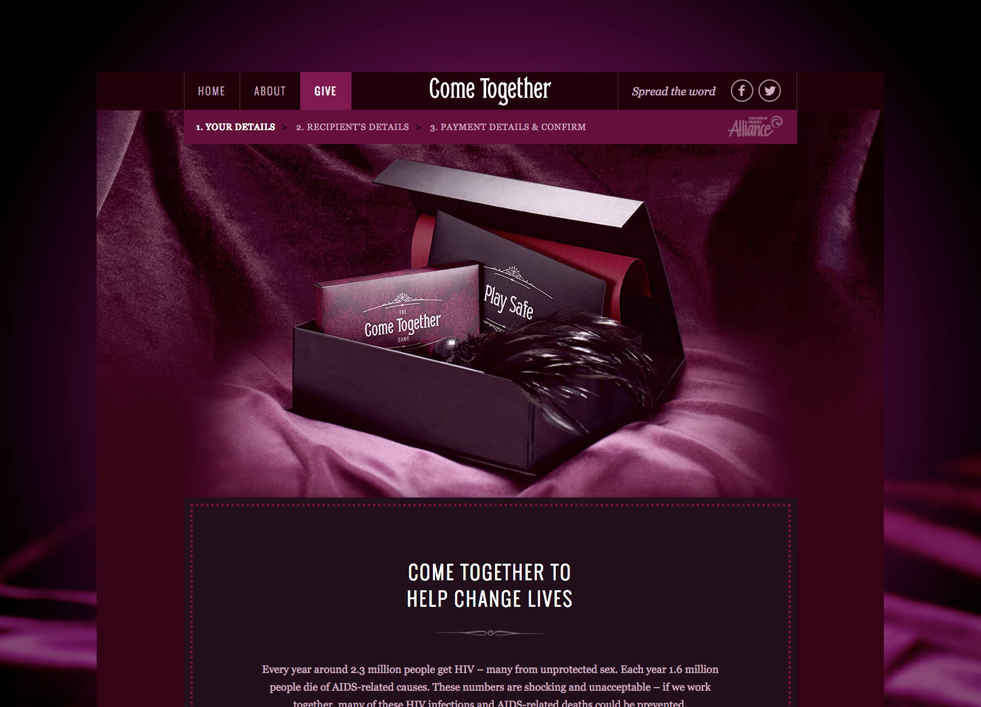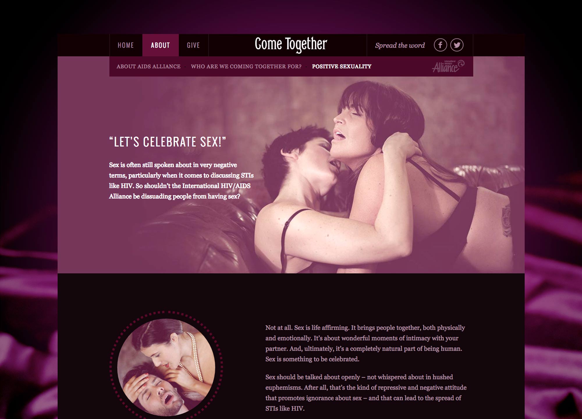 In my role at Bluefrog I was tasked with the design of the risqué Come together campaign website. The aim of the project was to increase awareness of HIV/AIDS and in doing so, raise the profile of the AIDS Alliance.