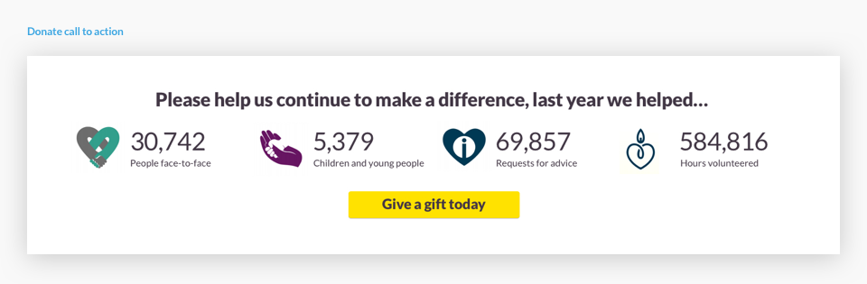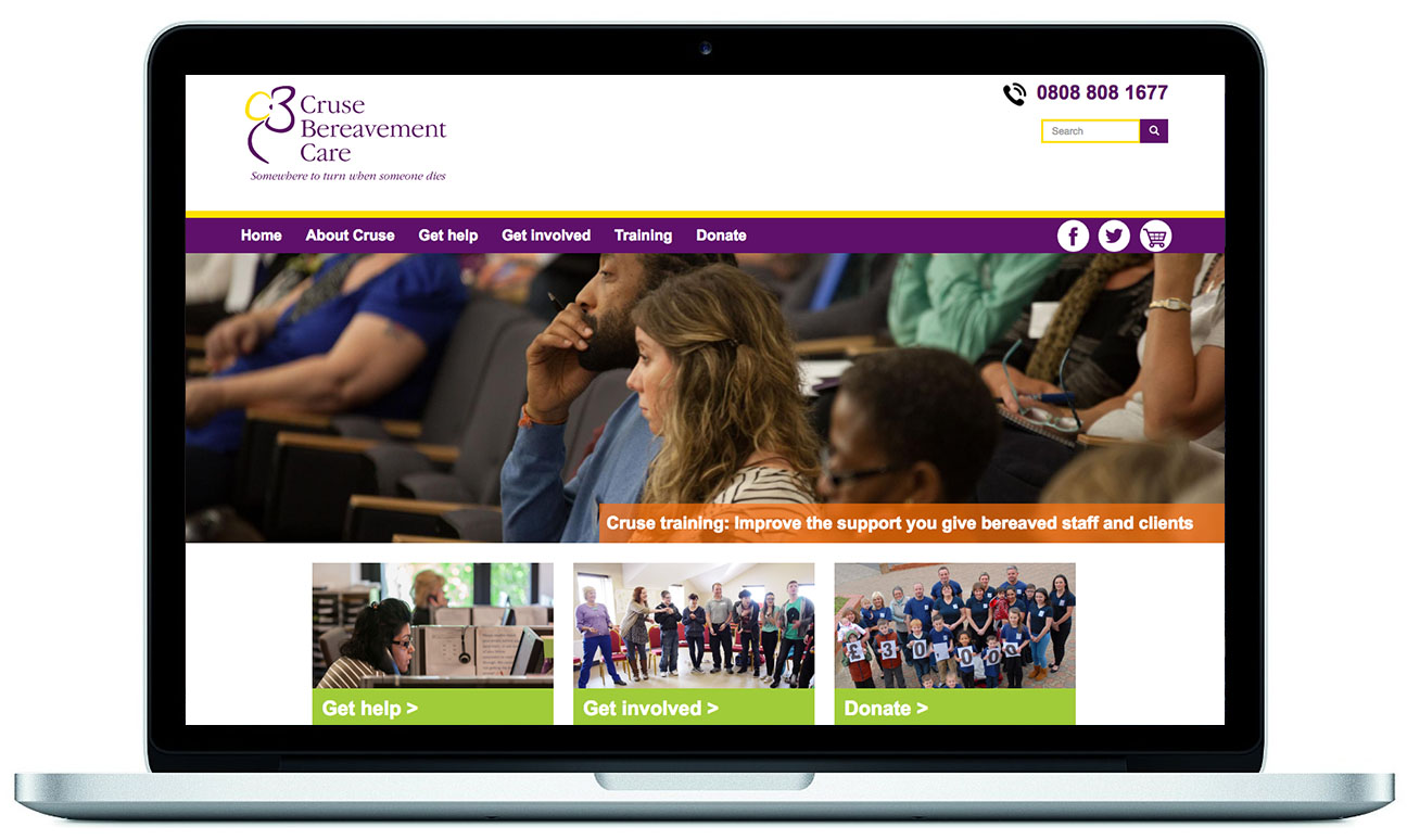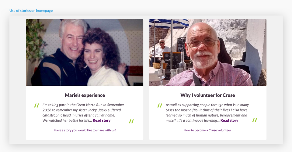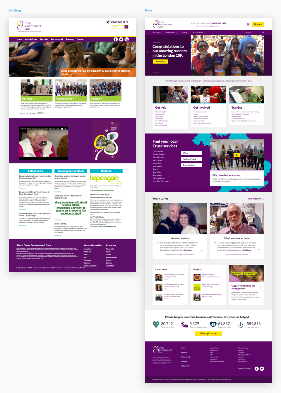 My user testing indicated that some participants were not clear on how Cruse was funded, why they needed donations and how many people they actually help. To resolve this, I included a brief call to action at the base of the homepage outlining key achievements and details of how the user can help to continue this work with a donation.