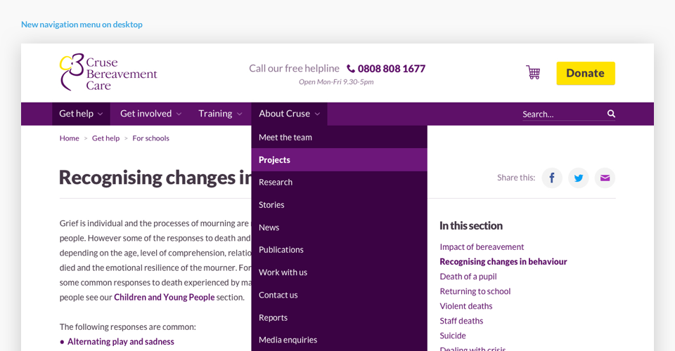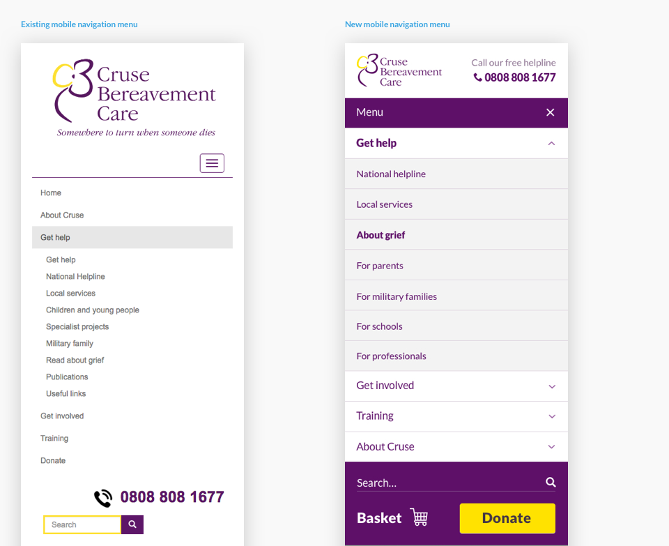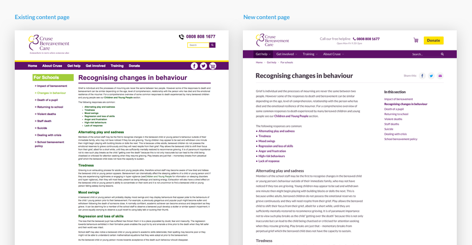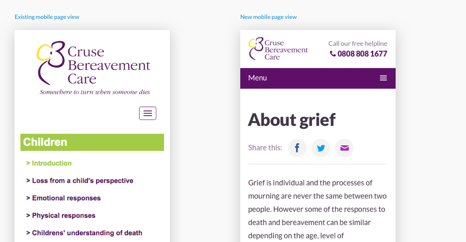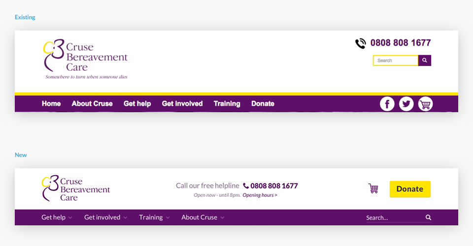 My usability testing had highlighted that the existing Cruse logo conveyed the organisation's purpose very effectively at a glance. By removing the logo's strap line, I was able to reduce the height of the header, creating a cleaner look and feel, and avoiding readability issues when the logo is scaled down on smaller devices.