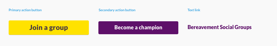 - A more consistent use of interactive colours. For example: purple for text links; yellow for "action" buttons; and purple for secondary "action" buttons (see below).